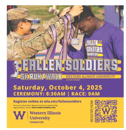 Registration for this year's Fallen Soldiers 5K Run/Walk is $30 through Monday, Sept. 15. After Sept. 15, the cost of registration for the in-person race is $35. WIU students can register up through race day for $10. The cost includes a participant shirt, finisher’s medal and access to the refueling station at the end of the race.