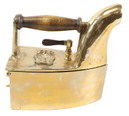 This brass-plated iron by J. Schwieger and E. Frost has a hinged lid that closes with a latch, keeping the coals safely inside, and a vent that allows air in to flow around the coals and directs smoke away from the ironing -- and from the person doing it. This iron sold for $248 at Hartzell’s Auction Gallery. It’s safe to assume it was bought by a collector, not for practical use.