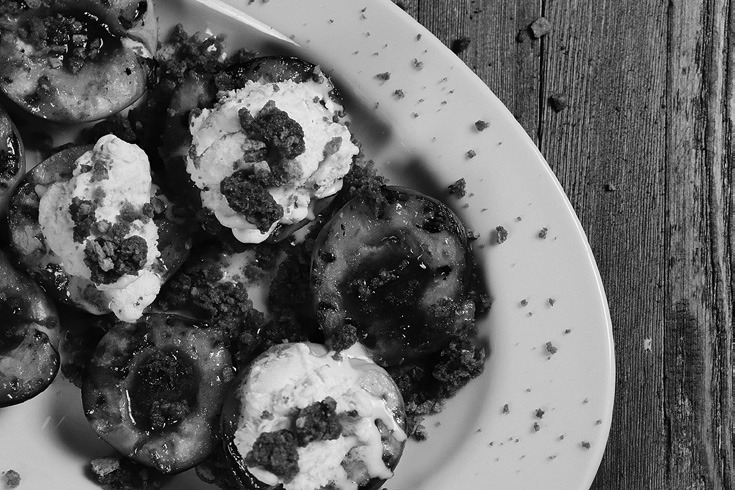 If you’re serving the crumble (below), make that first and set aside. Preheat grill or grill pan to medium heat (about 375 F to 400 F degrees). Clean and generously oil the grill.