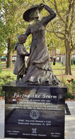 On Sept. 12, 2015, the Macomb Woman's Club dedicated the McDonough County Women's Social Services Memorial on the west side of Chandler Park, 'Facing the Storm,' which honors, memorializes and celebrates women in Macomb. The bronze statue and monument memorialize women who made it their life's work to protect children, women and animals before laws and societal norms were in place to do so.