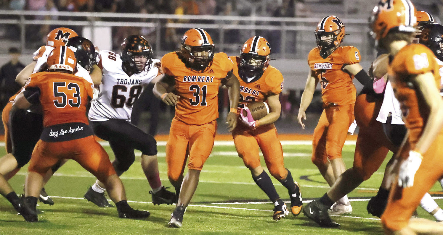 The Bombers upended the Trojans’ opening drive when running back Myles Alger was stopped short of a first down at the E/B 47 to turn the ball over to MHS.