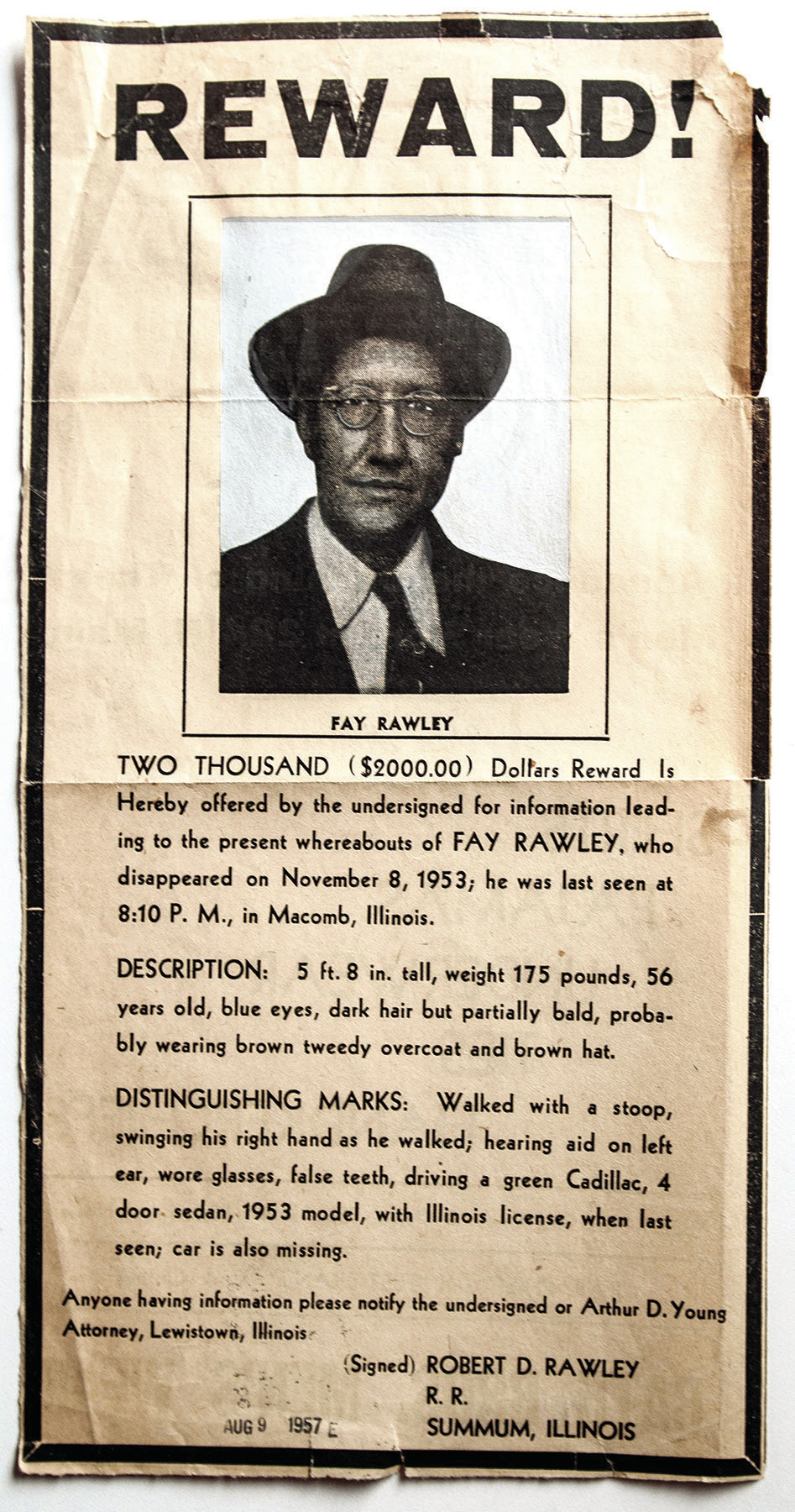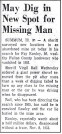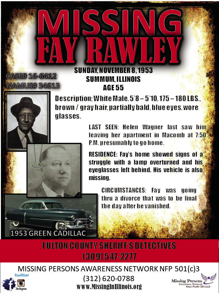 When it was realized that Fay Rawley was, indeed, missing, an attorney froze all of Rawley’s accounts. Rawley’s son and family publicized that Fay was missing, offered rewards, and advertised the fact all over west-central Illinois and elsewhere-to no avail. Fay Rawley had vanished.