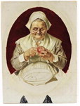 The “Peeling Apples” study is clearly unfinished, with visible grid lines and parts left without paint, but it still has appeal. The unfinished spots provide a glimpse of the work that goes into the illustration. Like a Thanksgiving meal, it looks like a labor of love.