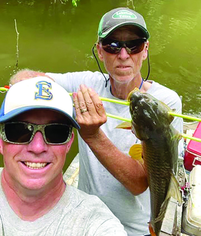Craig and son Cyle Rigg both shot at the same carp — two arrows, 1 carp.