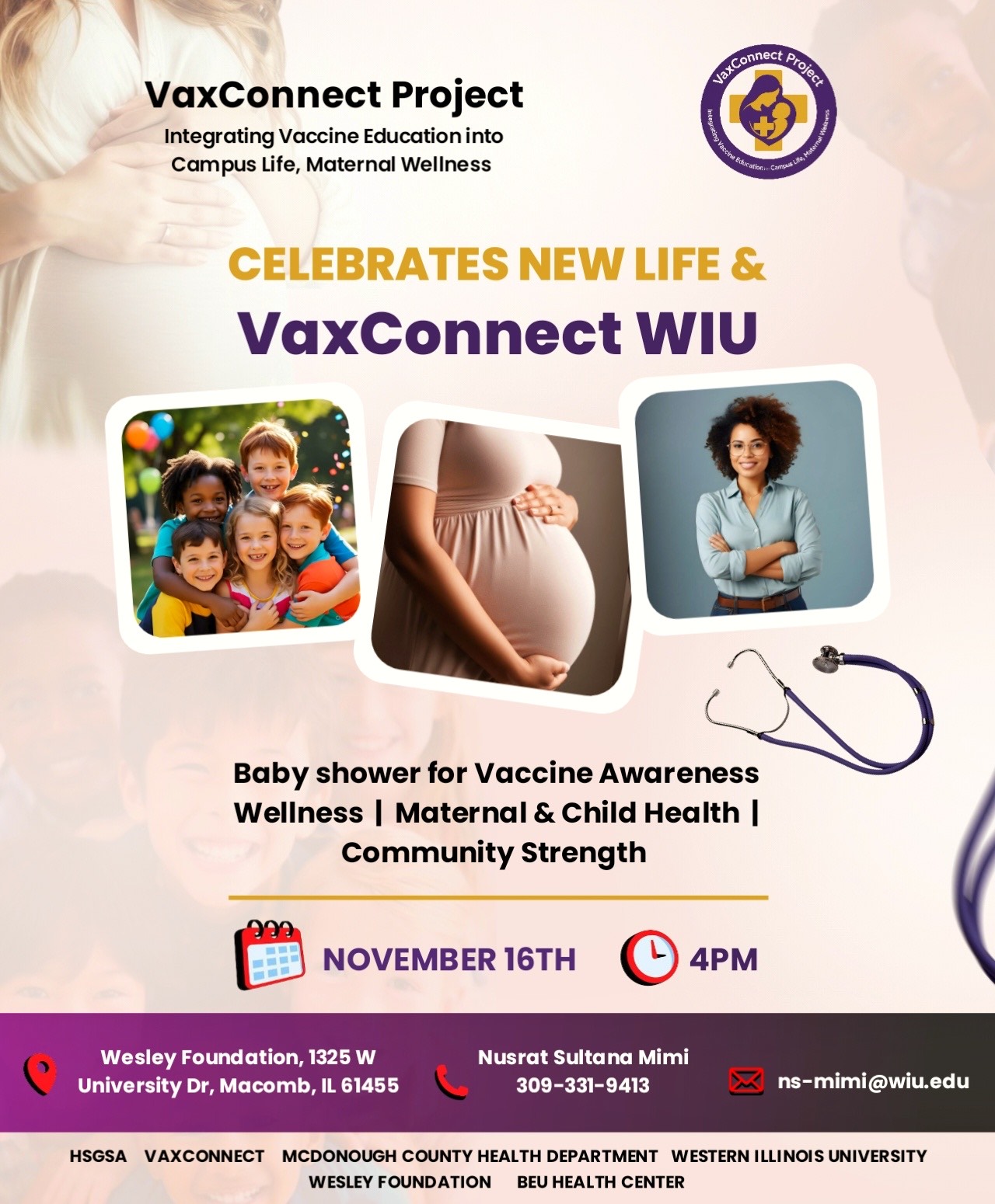 The student-led initiative, coordinated through the Health Sciences Graduate Students Association (HSGSA), is funded by a $2,500 grant from the Illinois Chapter of the American Academy of Pediatrics (ICAAP) and supported by the Wesley Foundation, a faith-based organization on campus. Students interested in volunteering or learning more about Vax Connect can contact the Health Sciences Graduate Students Association (HSGSA) or reach out through the Wesley Foundation at WIU.