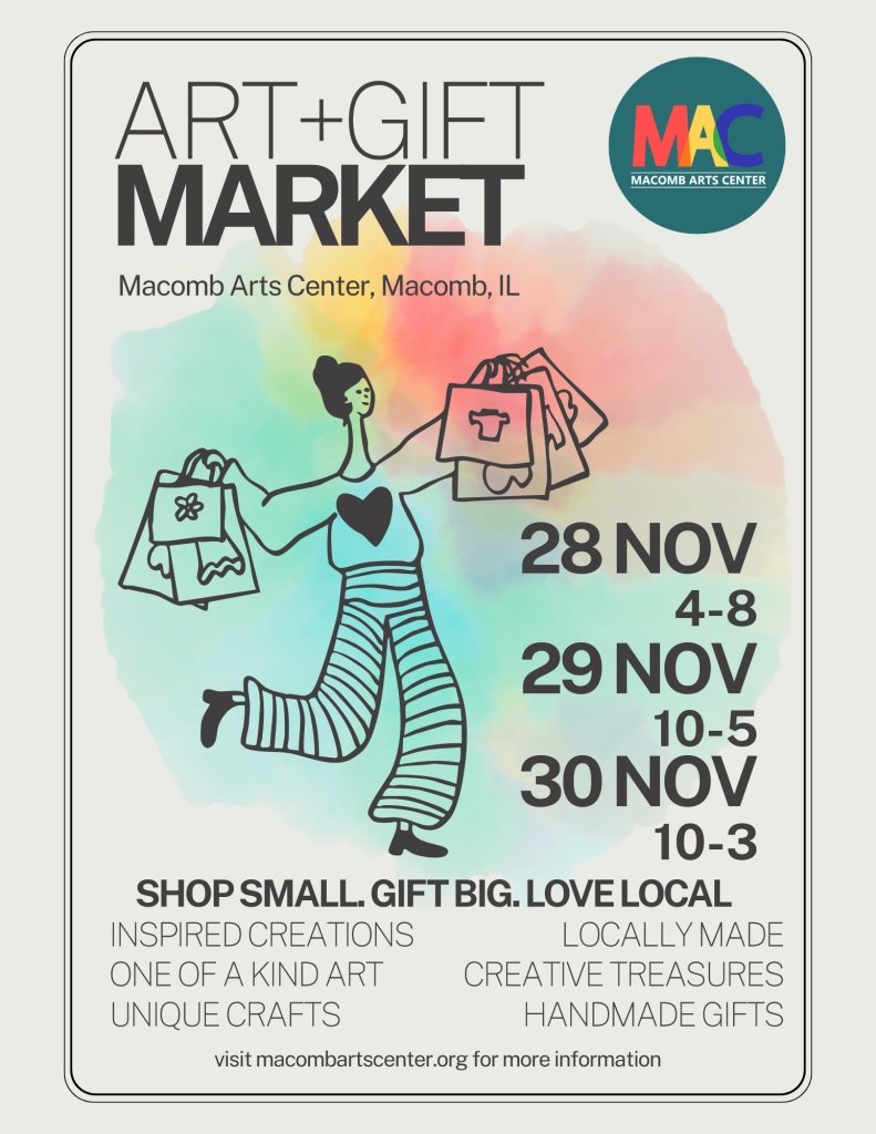 The Macomb Arts Center will hold its Annual Art & Gift Market, Sunday Nov. 30th from 10am-3pm This festive holiday shopping event brings together talented local artists and makers offering one-of-a-kind, handmade goods — perfect for holiday gifting (or treating yourself!).Browse unique art, crafts, jewelry, home décor, and more.Enjoy the holiday spirit while supporting local creativity.Find gifts that are as special as the people you’re giving them to.
