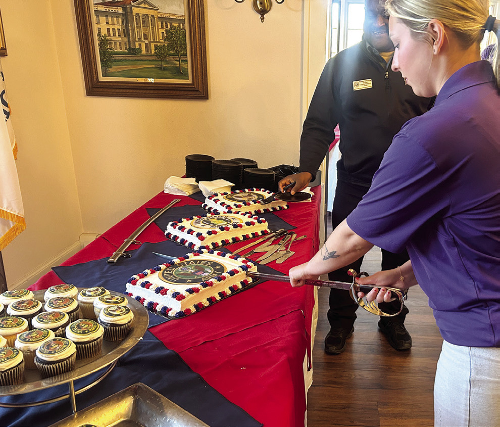 U.S. Army Veteran Chyneah Holt uses the ceremonial sword to present a piece of cake to Army Veteran John Hemingway.