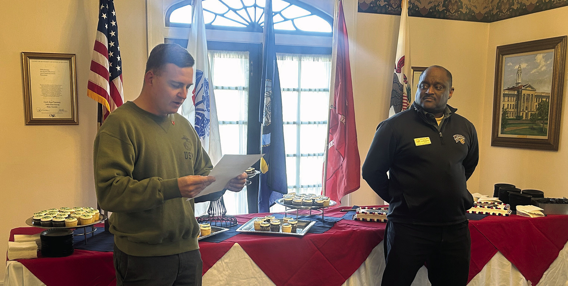 WIU Graduate and Marine Corps Veteran Cory Booher kicked off the celebration by reading a birthday message penned, and first read, by Marine Corps Gen. John LeJeune on Nov. 10, 1921, which commemorates the Marine Corps' history. The message is read every Nov. 10, with an updated conclusion added for the respective year. The message emphasizes the 'eternal spirit' of the Corps and that its history is a record of honor and achievement in both war and peace, from the earliest battles to modern conflicts.