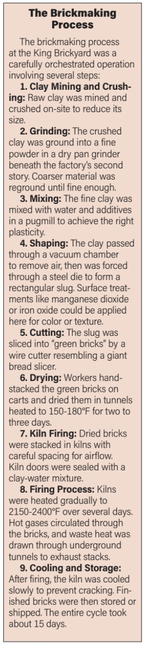 Legacy and Impact - At its peak, the brickyard processed 50 tons of clay daily, producing 60 bricks per minute—over 86,000 bricks every 24 hours. The King Brickyard supplied brick and tile across nearly every U.S. state.