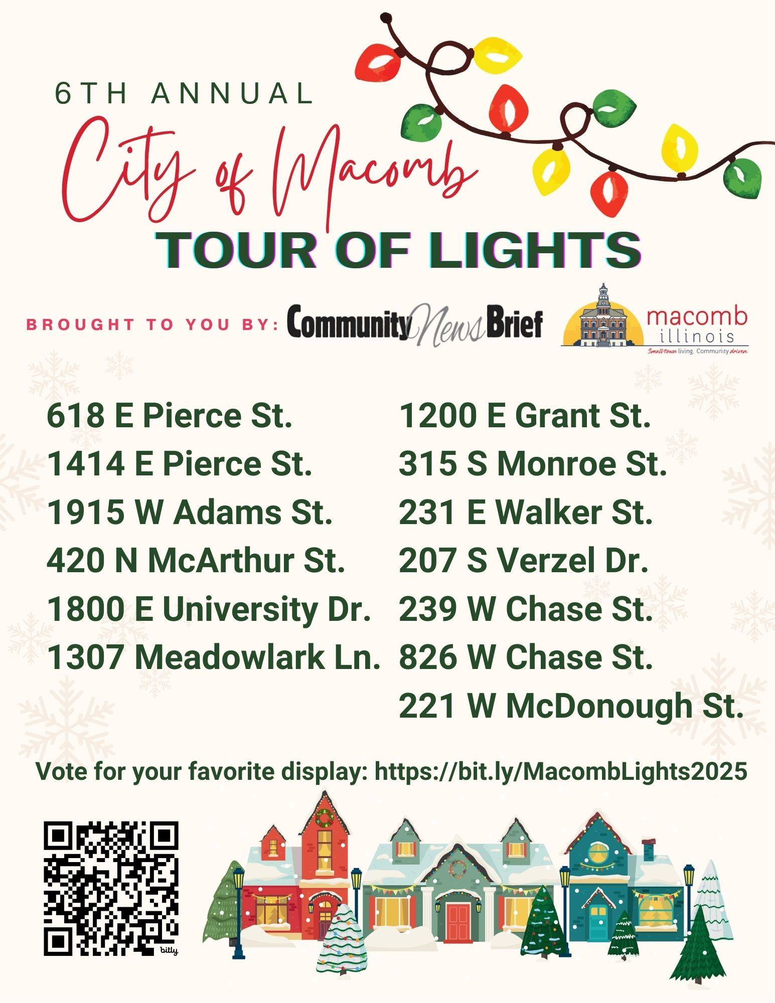The City of Macomb Tour of Lights is ready for holiday viewing by visitors and community members. This year, those who tour the lights can vote for their favorite display by using the following Jot-Form link: https://bit.ly/ MacombLights2025. Only one submission will be accepted per voter.