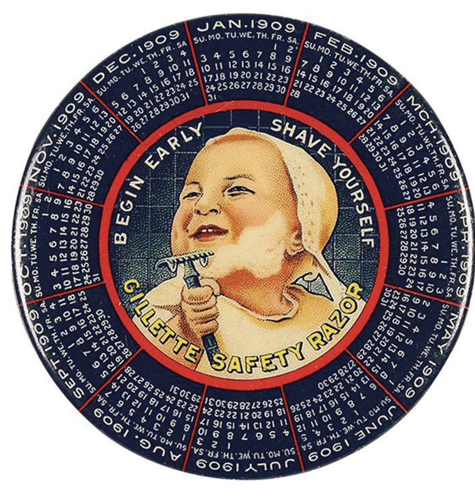 Oh, and it’s not just a calendar; it’s a pocket mirror, too. They were a popular form of advertising in the early 20th century. These mirrors, like the Gillette one here, often had celluloid backs printed with the company’s name, logo or slogan. But despite the product it advertises, a mirror like this one, at 2 1/2 inches in diameter, probably wouldn’t be the best for shaving.