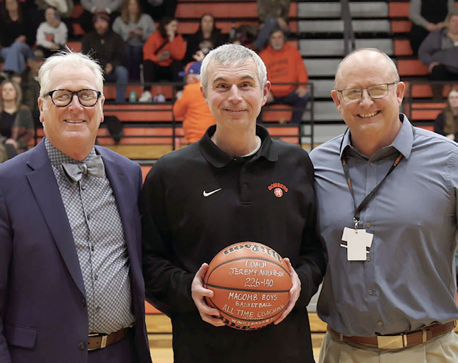 The victory capped a special evening for Anderson who became the program’s all-time winningest head coach after the Bombers defeated Geneseo 63-52 on December 2. At the time, that gave Anderson his 226th victory at MHS and prior to the contest, Anderson was awarded an inscribed ceremonial basketball to commemorate the achievement.