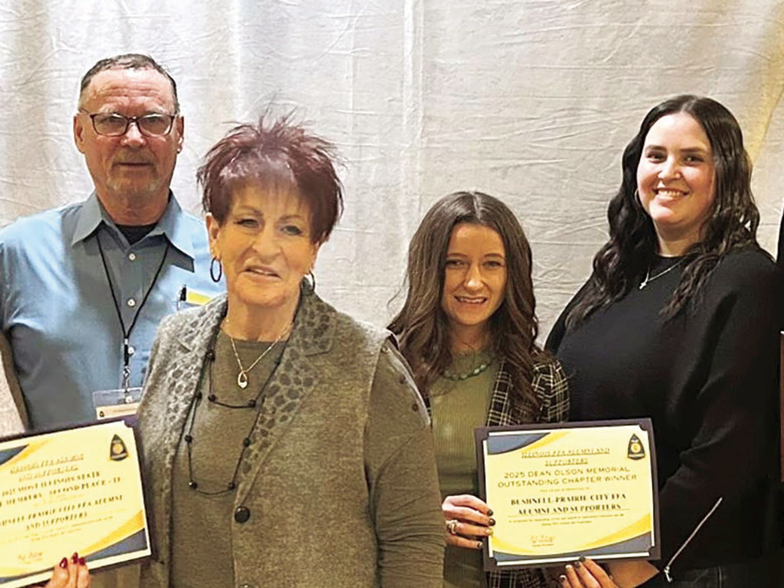 The Bushnell-Prairie City FFA had a great evening at the IL FFA Alumni Conference last week. The night kicked off with Curt Rigg singing the National Anthem. Bushnell's Ag and FFA teacher, Steve “Sarge” Sargeant, was recognized with the President’s Award, and Janet Rigg received the Dean Olson Memorial Outstanding Member Award. The Alumni chapter was also honored as a Gold (top) Alumni Chapter and for having the second-most Illinois State Lifetime Members. To top it all off, The B-PC SPARK-themed gift basket earned 1st place and was brought back to raffle off at the B-PC FFA upcoming Bingo Night.