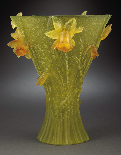 Glassworks like Daum made pate-de-verre pieces with three-dimensional flowers. They are often valuable today. This Daum vase made to look like a bunch of daffodils sold for $2,125 at Heritage Auctions.
