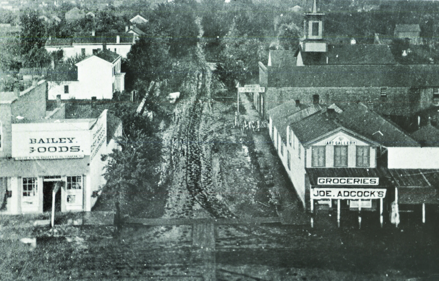 Of course, our villages were initially characterized by locally created stores, restaurants, and hotels— in an era before national chains were developed. For example, an 1872 Macomb photograph here shows East Jackson Street, entering the square—when the unpaved roads were all muddy due to a recent rain. On the left is George W. Bailey’s dry goods store, which had been built in roughly 1840, when small frame structures were replacing log ones. And across the street is Joe Adcock’s grocery store, which opened in mid-century. As I mention in Macomb: A Pictorial History (1990), “In 1852, there were, in fact, nine dry goods stores, two other clothing stores, two shoe shops, two drug stores, eight blacksmith shops, and various grocery stores, offices, and manufacturing places.”
