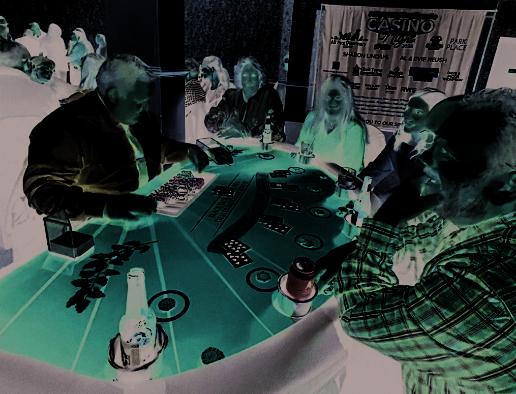 Additional gaming chips can be purchased for a nominal fee during the event, and at the end of the evening, attendees can trade in their chips for raffle tickets for chances to win a variety of prizes. Prizes include two $250 cash prizes; a lottery ticket 'tree' containing a bundle of potential winnings; a commissioned pet portrait from Tyler Henning (valued at $500); and the perennial grand prize of a week in Costa Rica (including a $500 Visa gift card), compliments of the Gossel family.