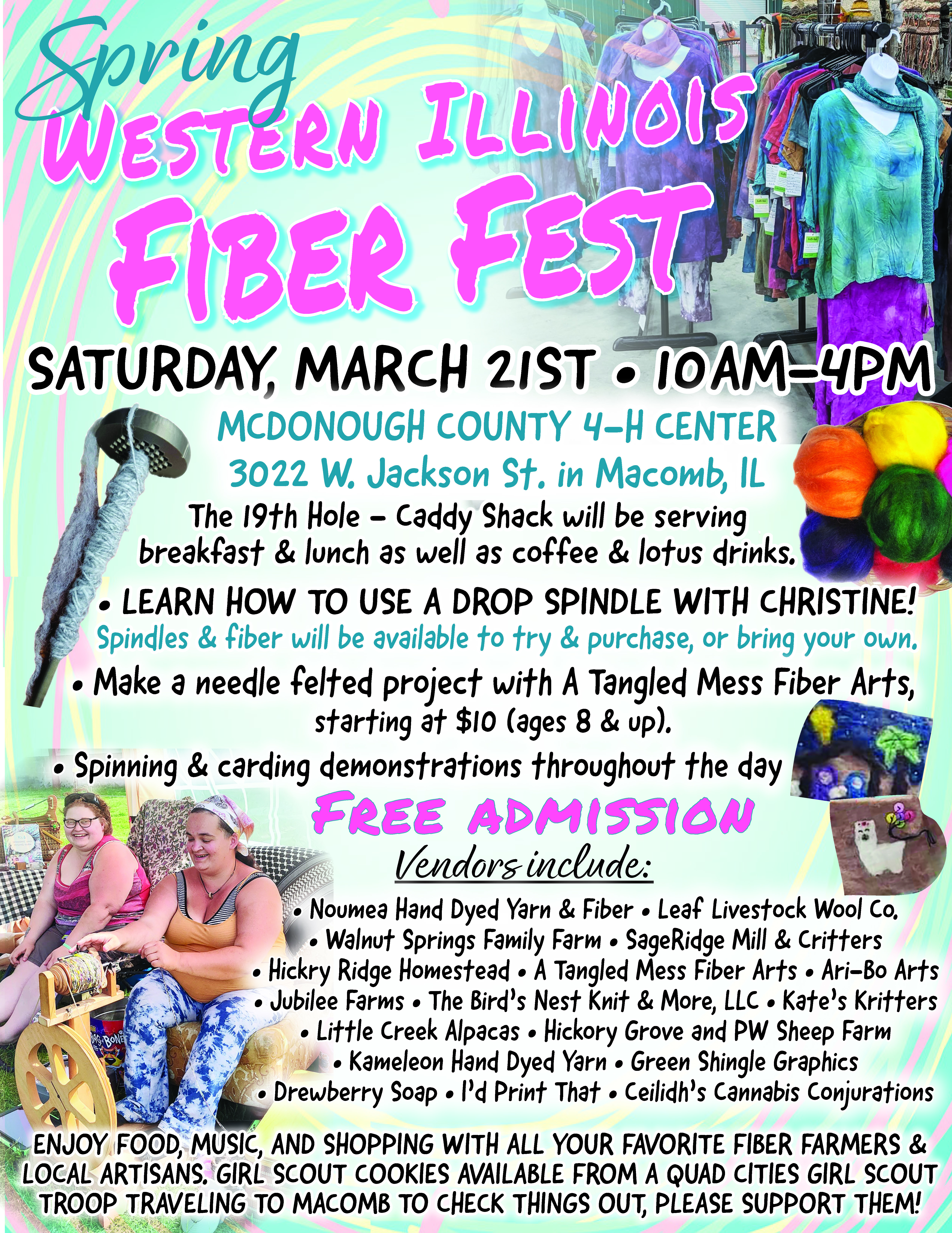 The 2026 Fiber Festival vendors include A Tangled Mess Fiber Arts, Noumea Hand Dyed Fiber & Yarn, Leaf Livestock Wool Co., Walnut Springs Family Farm, Hickory Ridge Homestead, SageRidge Mill & Critters, Kate's Kritters, AriBo Arts, Jubilee Farms, PW Sheep & Hickory Grove Farm, The Bird's Nest Knit & More LLC. Little Creek Alpacas, Kameleon Hand Dyed Yarn, Green Shingle Graphics, Dewberry Soap, I'd Print That, Ceilidh's Cannabis Conjurations, That Sassy Rabbit and more.