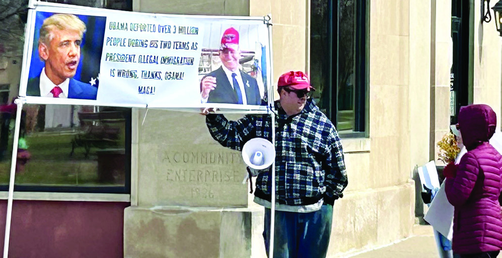 A MAGA supporter stood on the opposite side of the street with his banner supporting the current administration’s immigration policy.