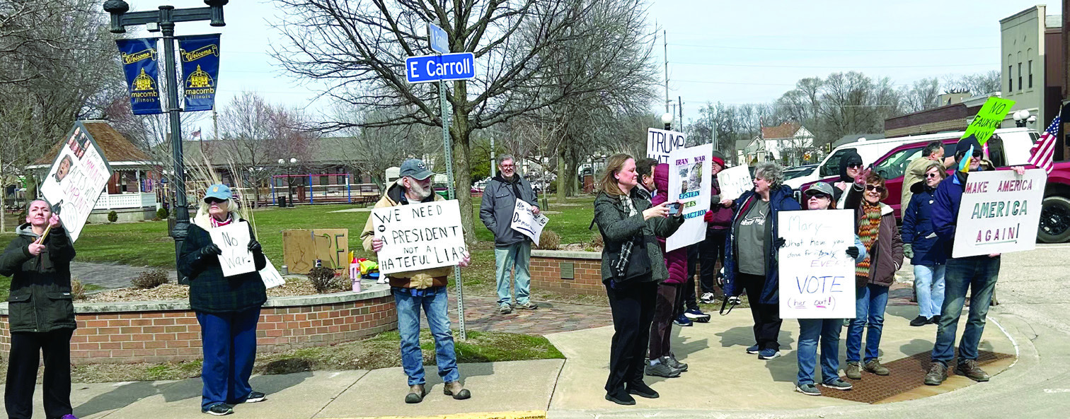 Miller was met by protesters from the McDonough County Democratic Central Committee, who came together across the street at Chandler Park with signs and bullhorns, and also walked past the window where Miller was seated indoors to express their dissatisfaction with Miller and the current administration.