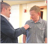 Ryan Van Dolah pins Blake Severs as a new member of the Rotary of Macomb Club.