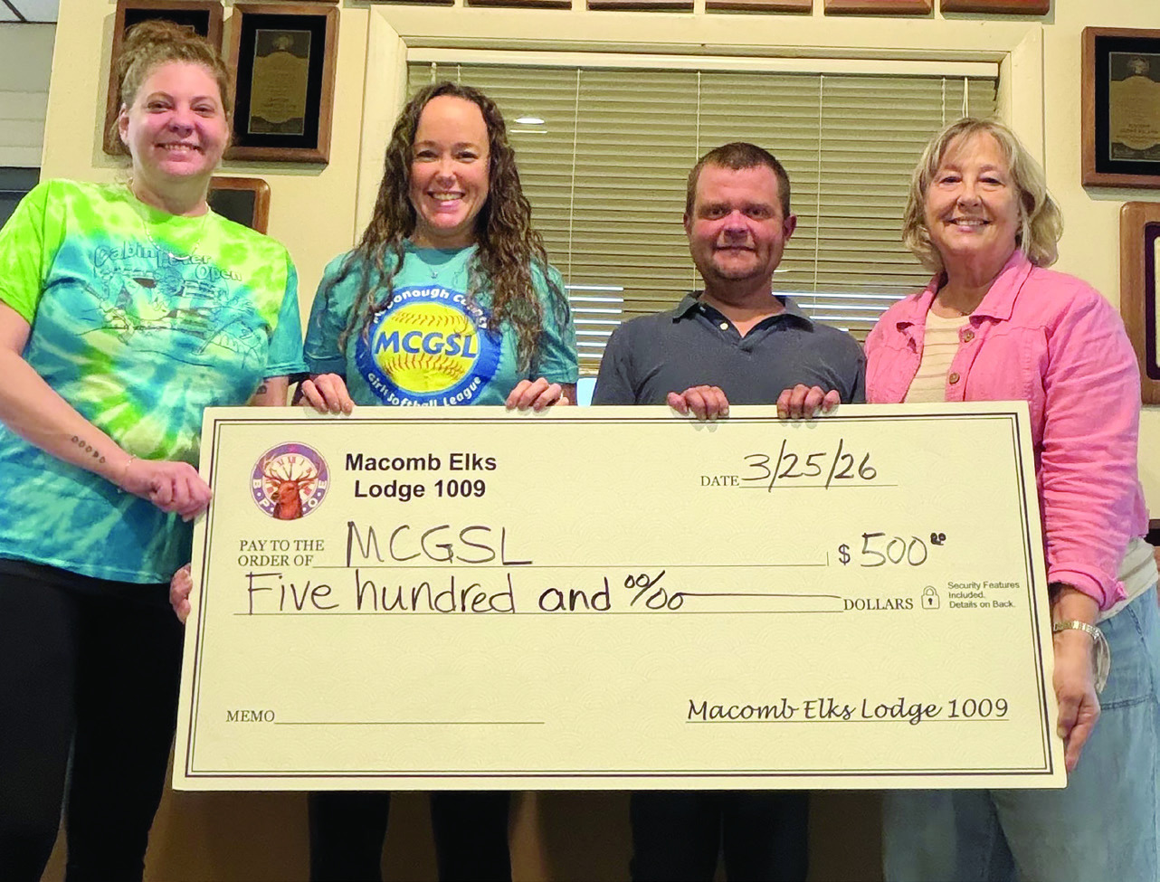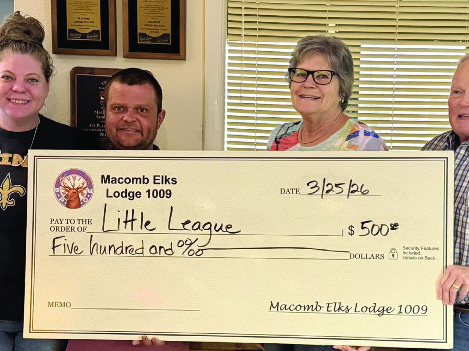 The Macomb Elks Lodge #1009 recently donated $1,000 to Macomb-area youth sports as part of the club’s philanthropic mission. Each year, nearly 30 area youth and social service organizations and events benefit thanks to the Macomb Elks Club’s benevolence. During 2024-2025, the Macomb club gave close to $22,000 to help local food pantries, youth sports, veterans programs and more. The club members live its principles, which are charity, justice, brotherly love and fidelity.