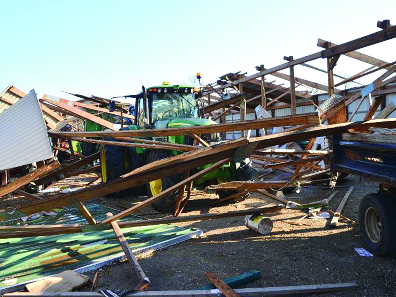 Several farm implements in both buildings were covered with roof debris. Several grain wagons were upended and lay on their sides.