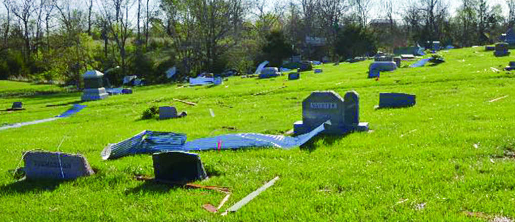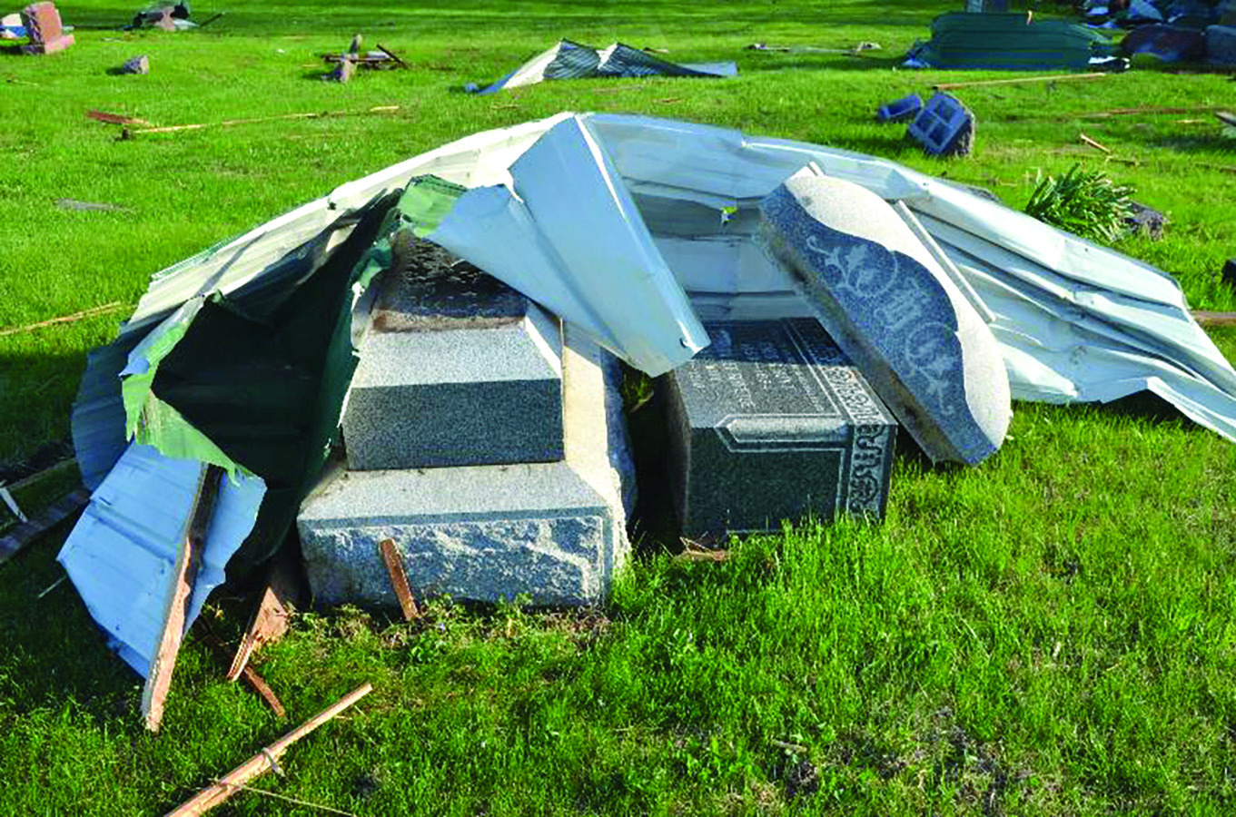 In the cemetery, about a dozen large stone monuments were toppled from their foundations, some of them encased in tin roofing. Lumber fragments were scattered in a 50-foot wide path from the driveway to the eastern fence line, gouging out divots and digging channels in the soggy cemetery ground. Fences on both sides of the cemetery were flattened by debris. The south half of the cemetery grounds were relatively untouched as were the plots and monuments across the ravine. Cleanup efforts are hampered by the saturated grounds.