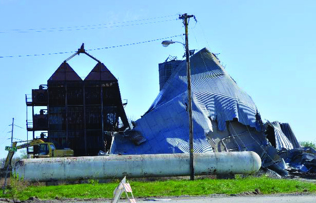 Colmar experienced the most devastation when the Western Grain Marketing bins were ripped from their foundations and scattered across the railroad tracks. One collapsed bin lay across N 450th Rd (Colmar Blacktop), closing the road. In addition, a metal building also sustained damage. One of the railroad crossing signal units was slightly damaged, but by Saturday morning, the tracks had been cleared for train traffic. Route 61 was open through the village.