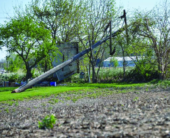 A few miles east of Colmar on N 450th, power lines draped across the road because an electrical tower in a field had been toppled.