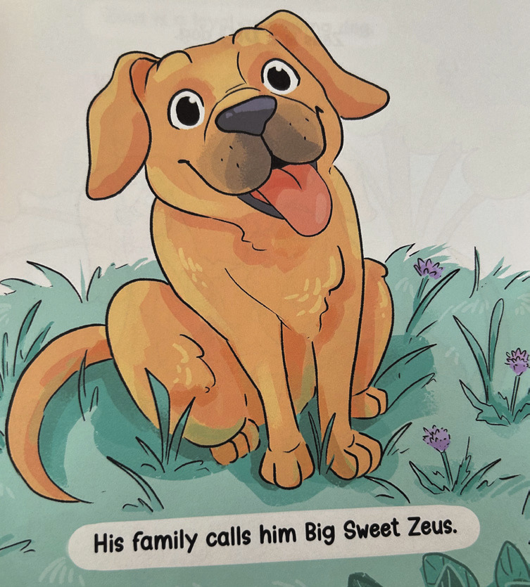 Nick and Ashley often referred to him as Big Sweet Zeus or Zeus the Wonder Dog, because the couple always wondered what was going through his head. Jahn said one of the favorite illustrations in the book is the picture of Ashley and Zeus together in the beginning pages, along with the page of Zeus chasing the birds, which actually look like they're in motion.