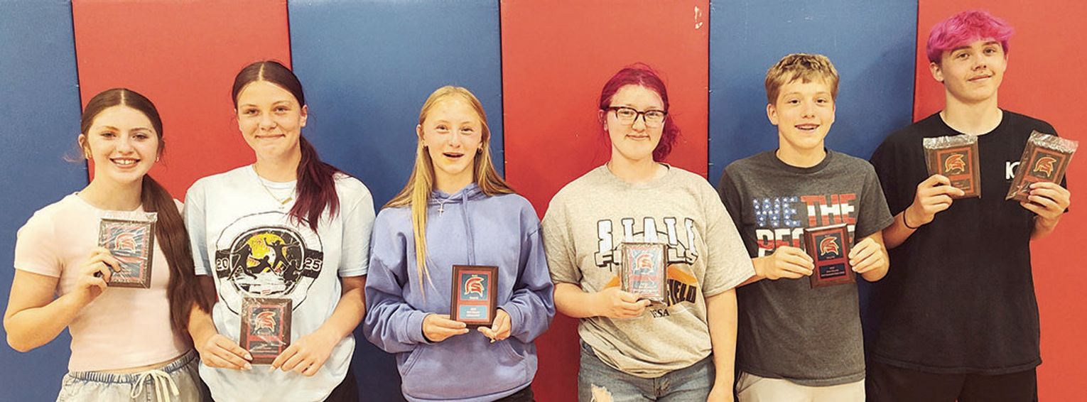 Bushnell-Prairie City Jr High Track award winners, pictured from the left: 7th Grade Girls MVP - Briella Pence; 7th Grade Girls Spartan Award - Hazel Farwell; 8th Grade Girls MVP - Marryn Ferguson; 8th Grade Girls Spartan Award - Scarlett Countryman; 8th Grade Boys Spartan Award - Landon Lear; 7th Grade Boys MVP and Spartan Award - Patrick Raines. (Not pictured) 8th Grade Boys MVP - Charles Rudolph
