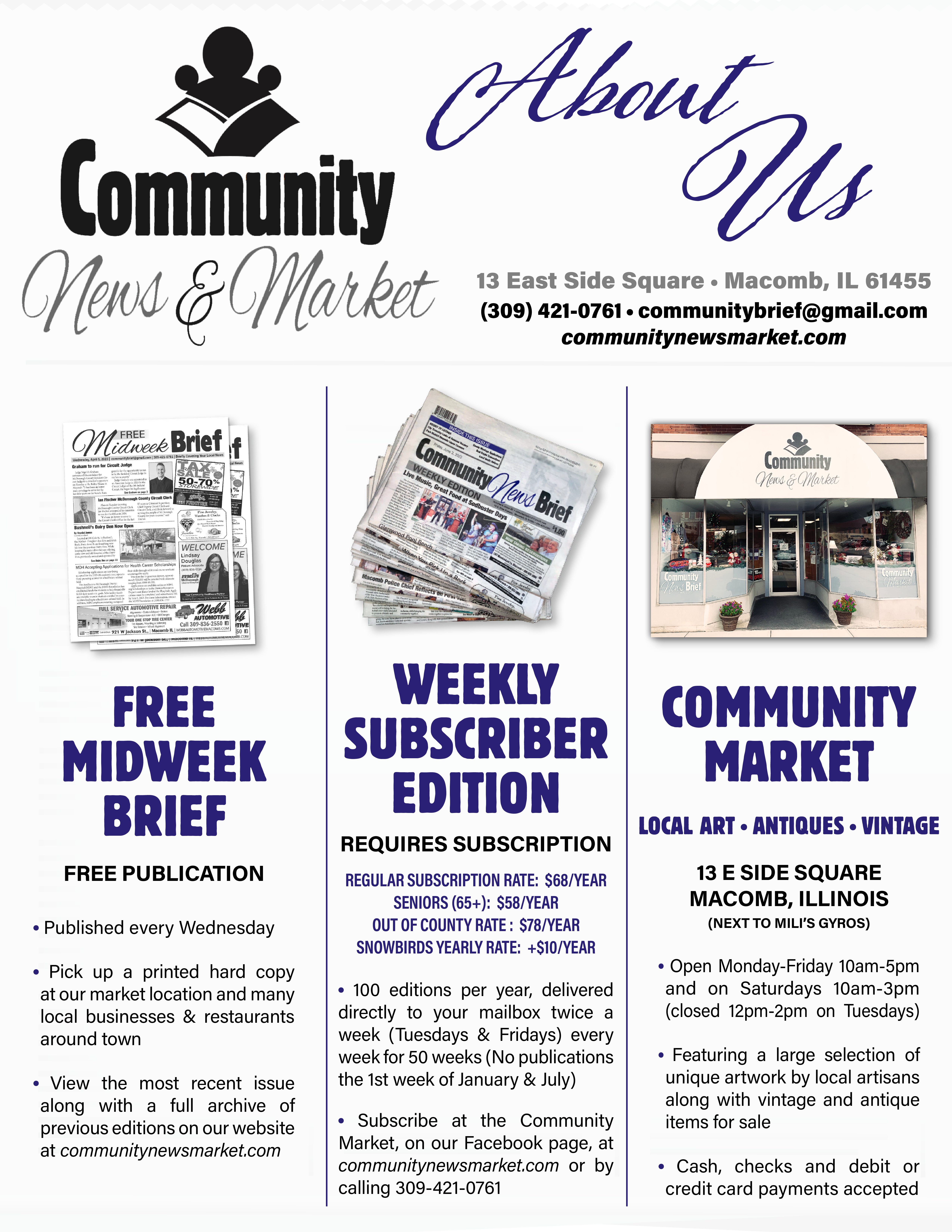 First established in 2017 as a three-day-a-week free community newsletter, The Community News Brief is now published twice a week as a 20- or 24-page newspaper, delivered to mailboxes and area businesses on Tuesdays and Fridays. The Community News Brief employs numerous experienced writers, including a full-time sports writer, two graphic designers, two delivery drivers and an office manager. The free community newsletter, The MIDWEEK, is still delivered on Wednesdays to area businesses.